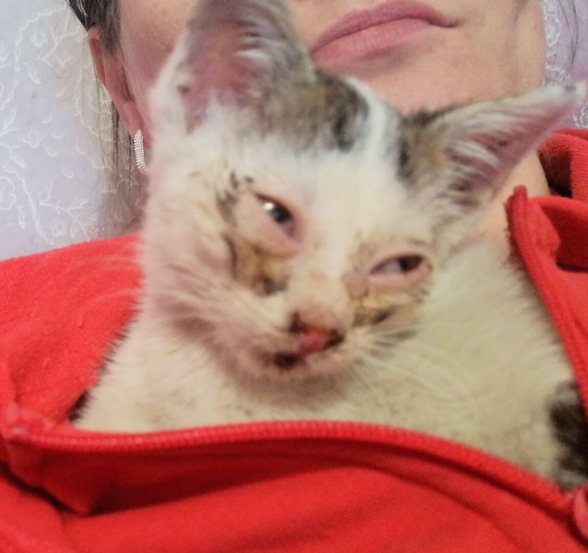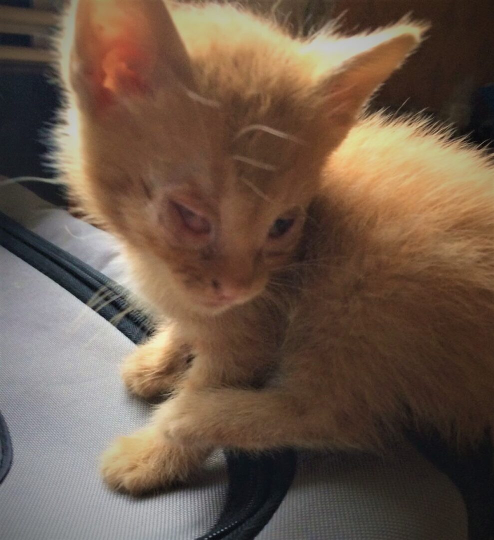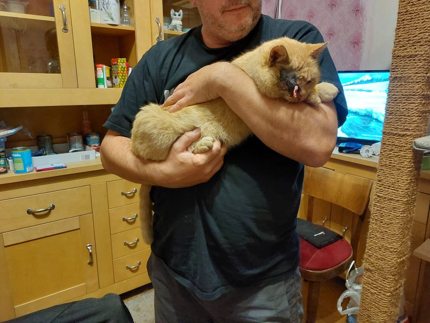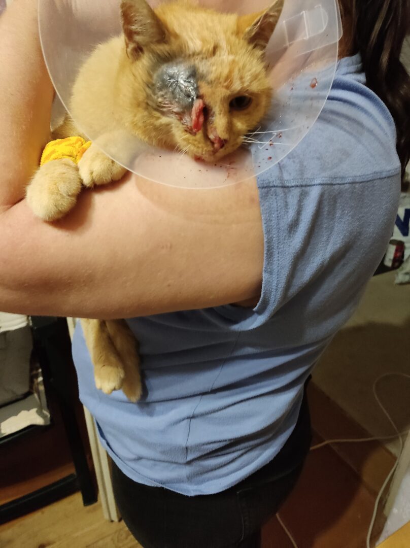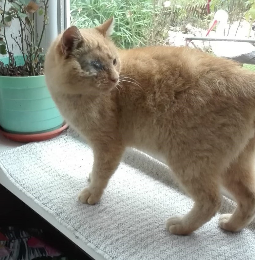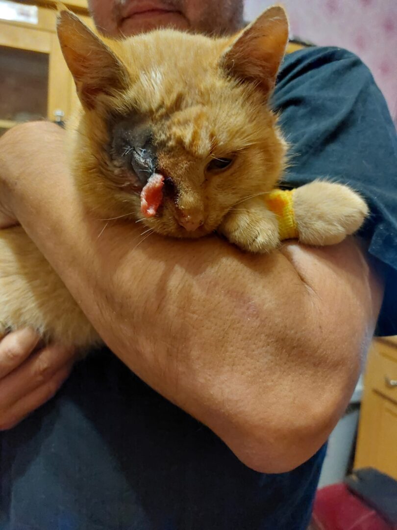 Dieser Kater wurde im Zuge eines Besuches bei einem Nachbarn entdeckt. Sein rechtes Auge war kaum noch in der Augenhöhle zu erkennen und er hatte bereits eine schwere, schmerzhafte Entzündung, die dringend behandelt werden musste.