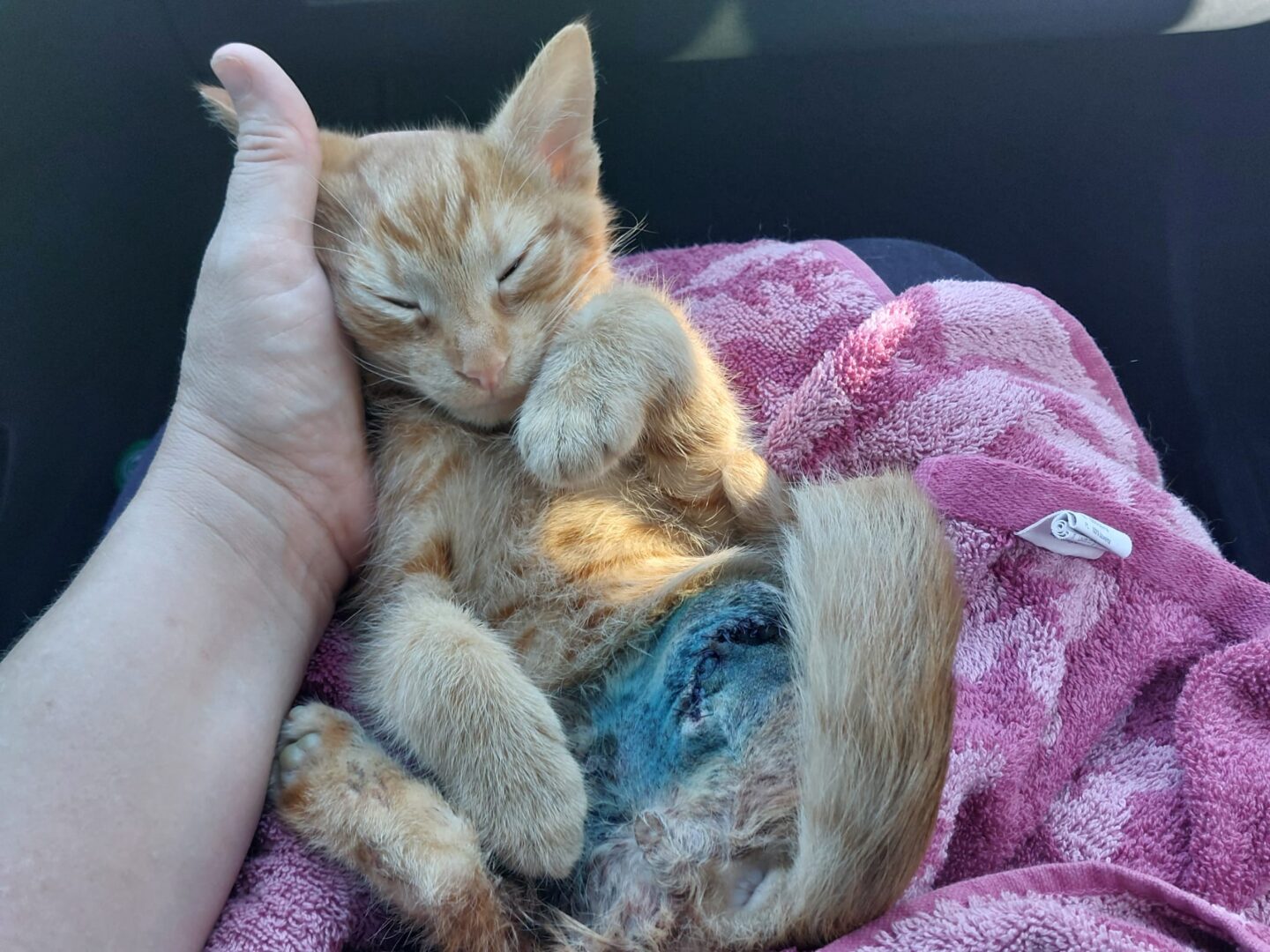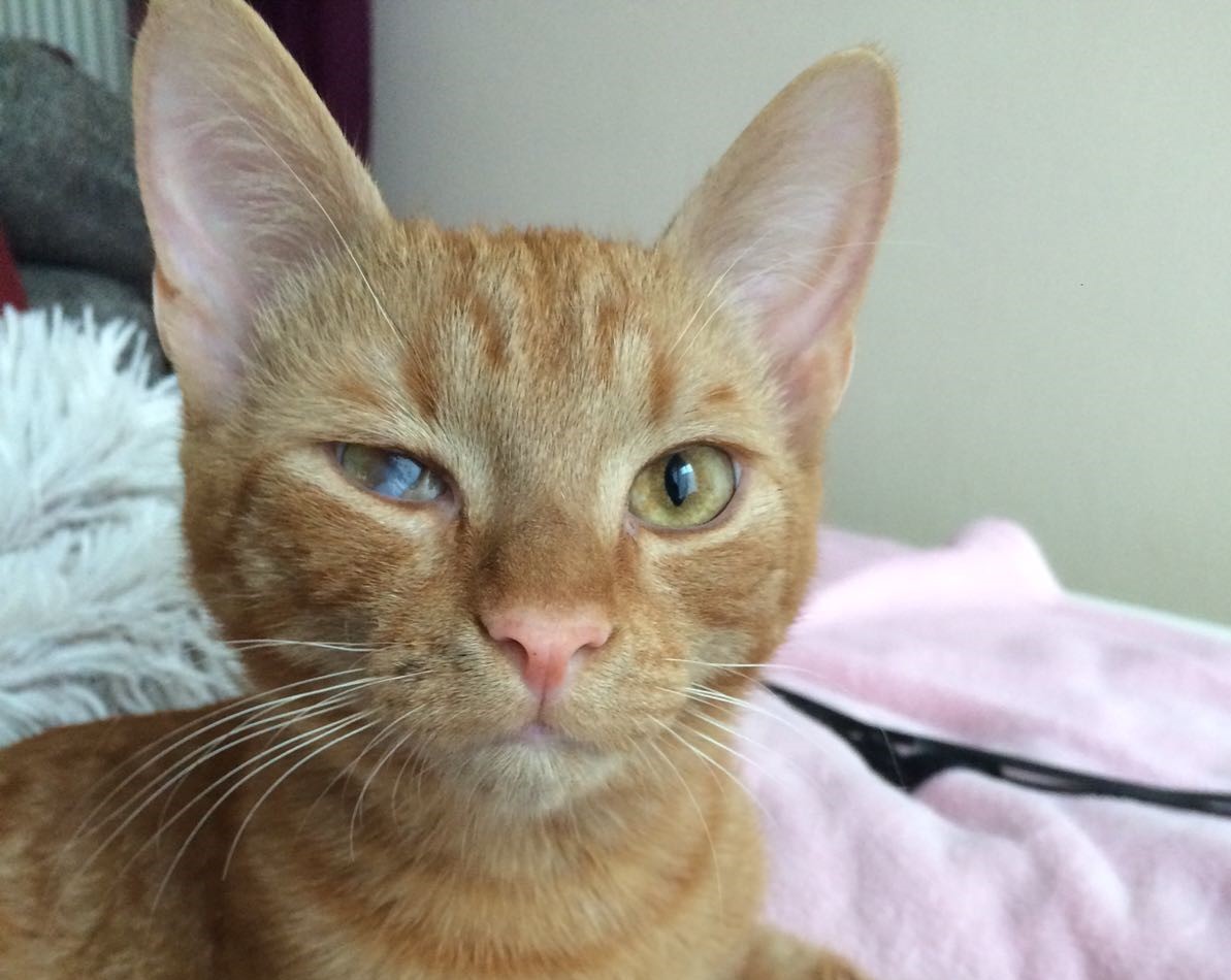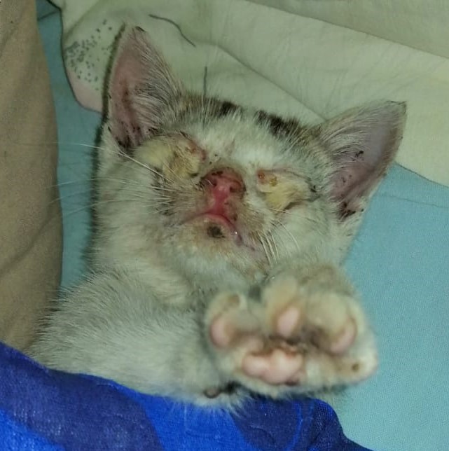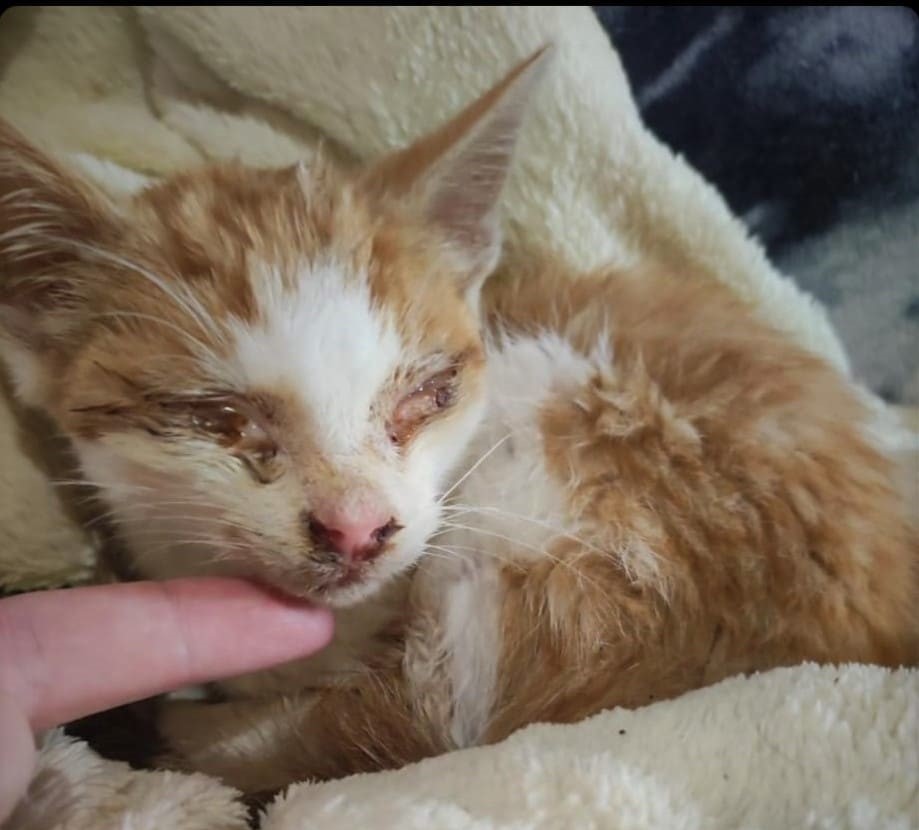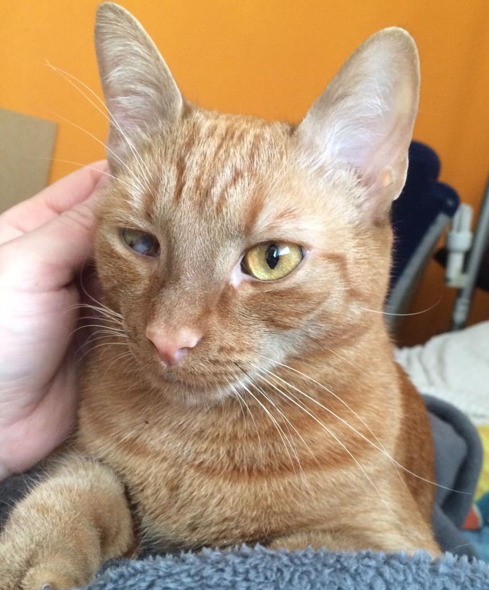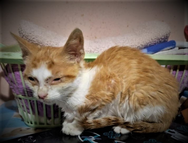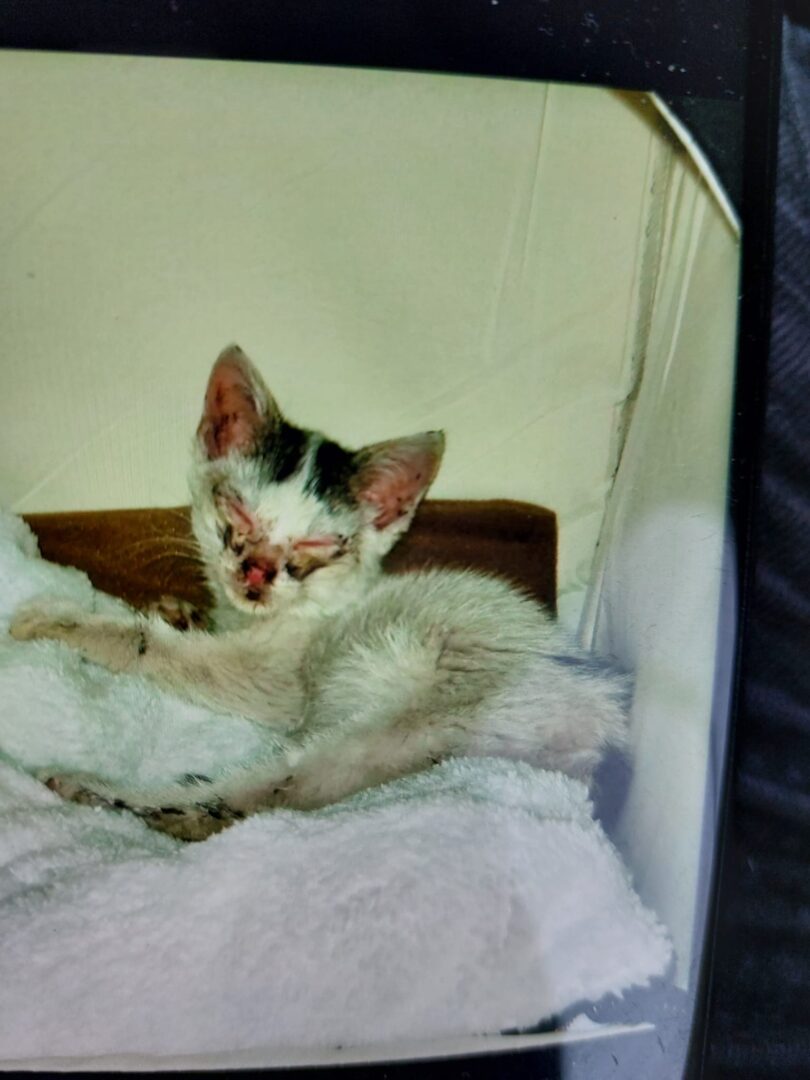 Dieser Kater wurde im Zuge eines Besuches bei einem Nachbarn entdeckt. Sein rechtes Auge war kaum noch in der Augenhöhle zu erkennen und er hatte bereits eine schwere, schmerzhafte Entzündung, die dringend behandelt werden musste.